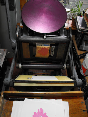 The front side image cut in linoleum and printed in two colors went smoothly, it will be a couple of weeks before the back side can be printed with the info from handset metal type. The front needs to be totally dry so the pressure of printing the back won't cause offset or smearing. the type is ten times easier than linoleum is to print as the minuscule amounts of surface lead to easier control of ink and pressure.