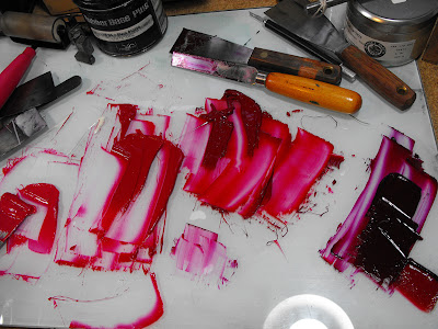 The ink color is a mix of Quinacridone Red & Carbazole Violet in a large portion of Transparent Base. All are Lithography Inks made by Daniel Smith, the Carbazole Violet is no longer made unfortunately. Exceptionally good stuff. Strong color and if you keep them transparent they really glow, especially Quinacridone Red.